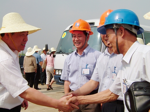 2005年時任集團公司黨委書記鄭加輝(左二)、黨委副書記關根(右一)陪同時任佛山市委書記黃龍云(左一)等市領導視察佛山市新聞中心工地
